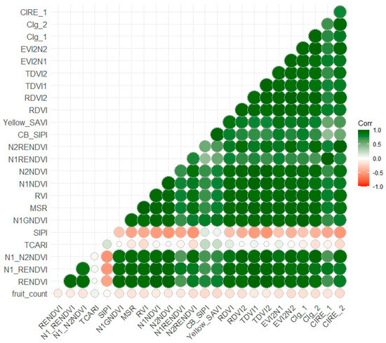 Correlation between fruit count and the 24 VIs using the entire datasets of 1958 datapoints. The green and red colour ramps show the strength and direction of the correlation being positive and negative, respectively.
