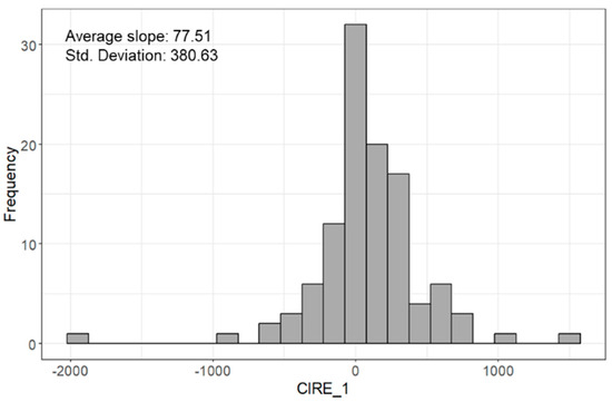 In an attempt to better quantify the influence of location, cultivar and season on the relationship between VIs and fruit count, a meta-regression analysis of slopes was conducted using a two-tailed t-test of the regression lines per block for all datasets and subsets. The results show that for all 24 VIs tested on the entire datasets, only two (N1RENDVI with p = 0.044 and CIRE_1 with p = 0.036) provided enough evidence for the rejection of the null hypothesis at p < 0.05. Figure 6 shows a histogram of CIRE_1 with the average slope and standard deviation. It was therefore concluded that the mean of the slopes for the relationship of fruit count with these indices was significant.