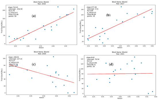 Relationships identified between RENDVI and fruit count: (a) and (b) were positive for 2016 and 2017, (c) negative for 2020 and (d) non-existent for 2021.