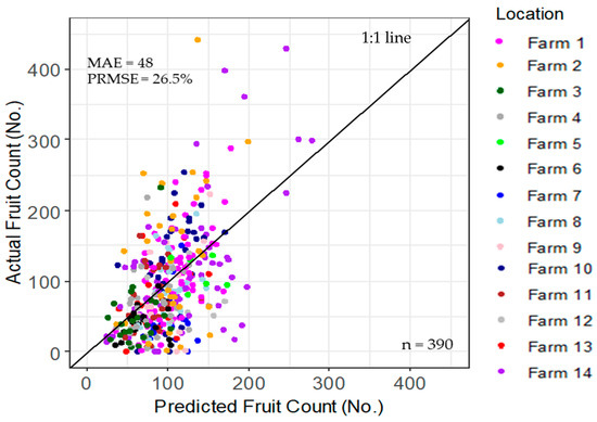 Using the RF model on the entire dataset and splitting it into 80% for training and 20% for testing to predict fruit count produced PRMSE = 26.5% with an MAE of 48 fruits/tree (Figure 8). Zero (0) predicted fruit counts were recorded due to the inclusion of calibration trees without fruits in some blocks across the period. This was accounted for by the model.