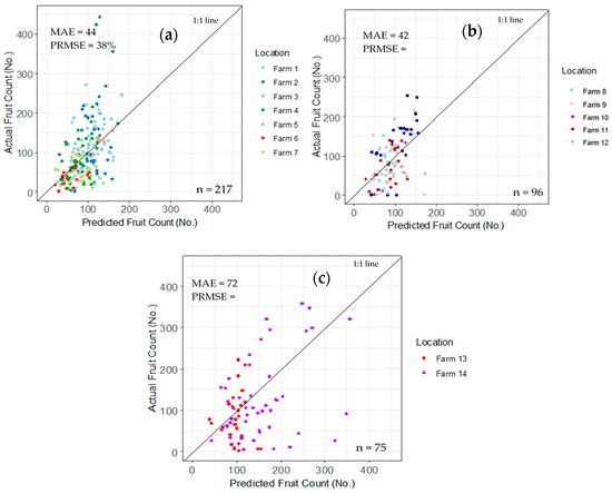 The lowest prediction PRMSEs from the location (region), cultivar and seasonal subsets were 29%, 19.3% and 32.6%, respectively. Using all the individual tree data combined, the PRMSE was 26.5%. Therefore, in situations where location-, cultivar- or season-specific models are required, the subset models could produce appreciable accuracies. However, it would be more valuable to have a single generic model that is capable of predicting yield with satisfactory accuracy without restrictions from factors such as the cultivar, among others. Additionally, SE–QLD produced a relatively higher average number of fruits per tree (115) than the NT (94) and N–QLD (91) regions. These predicted average fruit counts and associated errors are consistent with the findings of Anderson et al. [10] and Payne et al. [52].
