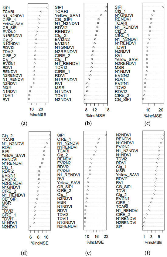 Assessing the number of predictors in the locational models demonstrated that, out of the 24 VIs used, 6 of them (SIPI, TCARI, Yellow_SAVI, N1/N2NDVI, CIg_2 and CIRE_1) were found to contribute more to the prediction from the variable importance plot list (Figure 9) in the RF models for both the combined and subset models. Out of these six VIs, SIPI and TCARI were usually in the top two out of all the models as the most important predictors. Although TCARI is mainly a pigment-related VI, it is also structure-sensitive and resistant to variations in LAI; therefore, it has the ability to capture vital information in the canopy that other VIs may not resolve [30]. Generally, the accuracies achieved using the top six predictors were marginally lower than those obtained using all 24 VIs in the RF model. It is therefore better to use all 24 VIs in a machine learning model like RF to draw as much information as possible from the variability in the data. For the number of predictors involved in this analysis, computational time was not a challenge for the RF model. If a multiple linear regression model were used instead of RF, it is likely that a model with fewer predictors would have been optimal [53].