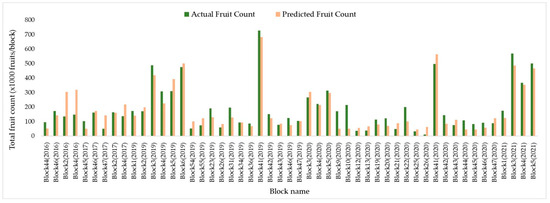This was compared with the grower-obtained actual yield (fruit count for blocks with available yield data at harvest spanning the period from 2016 to 2021) from the respective blocks to assess the performance of the model at the block level.