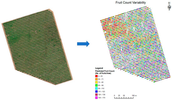 An example of a tree-level yield variability map derived from the RF-based combined model (right). The RGB image of the mango orchard mapped is shown on the (left). The legend presents an industry-based categorization of yield variability ranging from low (0–55) to high (139–170) for this study.