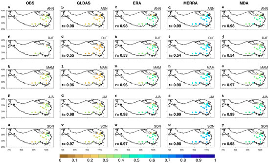 Annual and seasonal mean TPSM (units: m3×m-3): (a,f,k,p,u) observations as the reference; (b,g,l,q,v) GLDAS; (c,h,m,r,w) ERA5-Land; (d,i,n,s,x) MERRA-2; and (e,j,o,t,y) MDA. The pattern correlation coefficients are shown in the bottom-left corner of each panel.