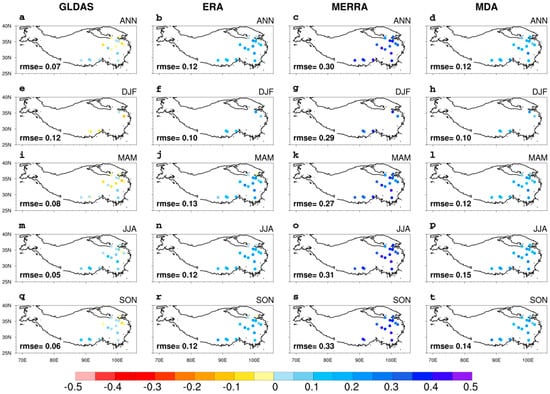 Differences in annual and seasonal mean TPSM (units: m3×m-3) between observations and data products: (a,e,i,m,q) differences between GLDAS and observations; (b,f,j,n,r) differences between ERA5-Land and observations; (c,g,k,o,s) differences between MERRA-2 and observations; and (d,h,l,p,t) differences between MDA and observations. The spatial RMSEs are shown in the bottom-left corner of each panel.