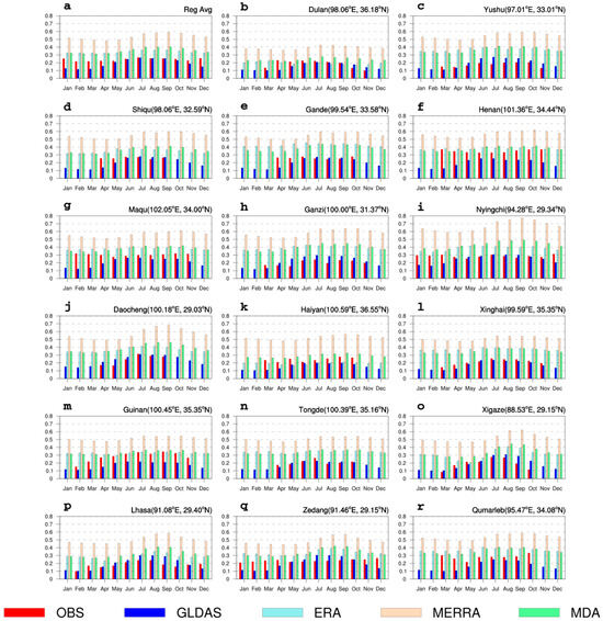 Figure 4 shows the annual cycles of monthly mean soil moisture on the regional average of TP and 17 separate stations. For the regional average of the TP (Figure 4a), the results of observations show that the fluctuation of the TPSM annual cycle is slight, which varies between 0.216 and 0.266. From January to April, soil moisture decreases from 0.252 to 0.224 and then increases and maintains at a relatively wet condition around 0.25 during summer. From September to December, soil moisture falls slightly again to 0.228 in autumn and turns up to 0.257 in winter. It can be observed there are two moist durations of soil in the TP, summer and winter, which is the result of snowmelt and monsoon precipitation in the summer [47,48] and the infiltrating effects of snow cover in the winter [49]. Three soil moisture products have different descriptions of the annual cycles of TPSM. Specifically, the overestimation of MERRA-2 exists every month, and the values in October, November, etc., are even more than two times those in observations. By comparison, GLDAS depicts values more similar to those of in situ measurement, especially in June, July, August, and September. While GLDAS underestimates the soil moisture in several winter and spring months. ERA5-Land is mediocre, the monthly mean values of which are between GLDAS and MERRA-2. As for MDA, the overestimation in MERRA-2 and underestimation in GLDAS are optimized to a certain extent, and the annual cycle displayed in MDA is similar to that in ERA5-Land. By comparing the correlation coefficients of the annual cycle curves between grid datasets and observations, most datasets capture the fluctuation of the soil moisture annual cycle, with significant coefficients (at the 90% confidence level) of 0.56, 0.47, and 0.52 for GLDAS, MERRA-2, and MDA, respectively, while ERA5-Land fails to pass the significance test, with a coefficient of 0.40. Therefore, the regional averaged annual cycle of TPSM in GLDAS more closely resembles that in observations, with lower deviation and higher correlation.