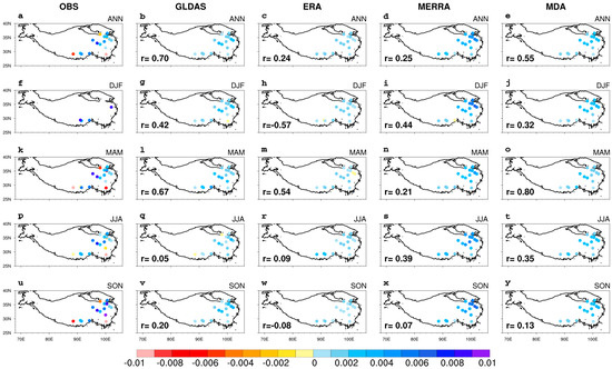 Linear trends of annual and seasonal mean TPSM temporal variation (units: m3×m-3/yr): (a,f,k,p,u) observations as the reference; (b,g,l,q,v) GLDAS; (c,h,m,r,w) ERA5-Land; (d,i,n,s,x) MERRA-2; and (e,j,o,t,y) MDA. The pattern correlation coefficients are shown in the bottom-left corner of each panel.