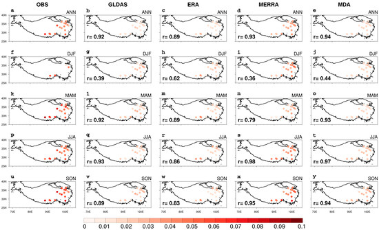 Temporal standard deviations of annual and seasonal mean TPSM (units: m3×m-3): (a,f,k,p,u) observations as the reference; (b,g,l,q,v) GLDAS; (c,h,m,r,w) ERA5-Land; (d,i,n,s,x) MERRA-2; and (e,j,o,t,y) MDA. The pattern correlation coefficients are shown in the bottom-left corner of each panel.