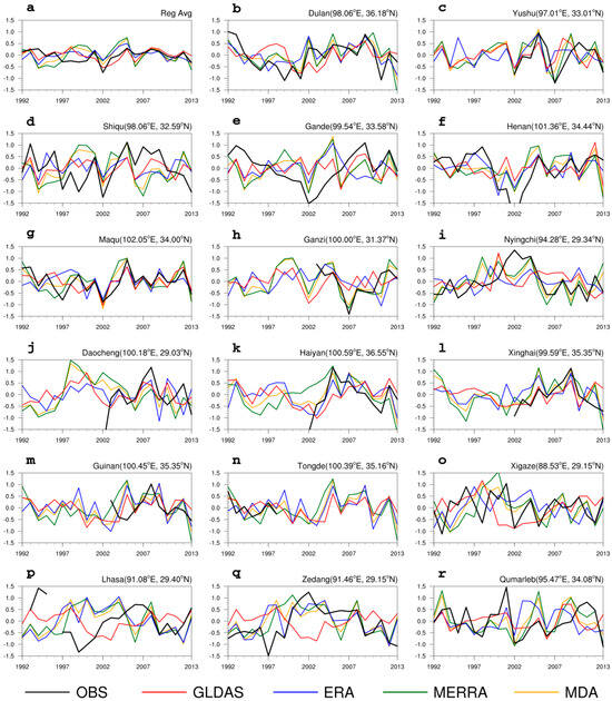 To further evaluate the ability of reanalysis and assimilation data to describe the characteristics of the soil moisture interannual variation of TP, we calculate the soil moisture anomaly indices by subtracting the long-term mean of 1992–2013. Figure 7 shows the standardized and detrended indices of in situ measurements and data products of the annual mean TPSM on the regional average and 17 separate stations. For the soil moisture indices of the regional average (Figure 7a), an interdecadal variation with a cycle of approximately 10 years could be found in the observations. GLDAS captures the characteristic well, and the correlation coefficient between it and the observations is 0.49. ERA5-Land and MERRA-2 do not catch the features of the observations well, and the correlation coefficients between them and the observations are 0.27 and 0.19, respectively. After averaging three data products, the corresponding correlation coefficient of MDA is 0.28, which performs moderately.