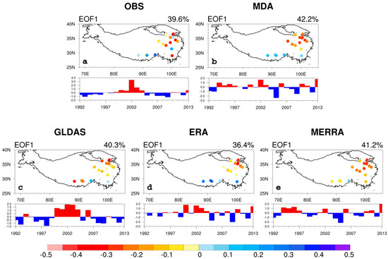 To investigate the ability of data products to describe the temporal-spatial variation of TPSM, the EOF is used to extract the major temporal-spatial patterns of TPSM anomalies from 1992 to 2013. Figure 9 displays the first EOF pattern (EOF1) and corresponding principal components (PC1) of the EOF analysis of observations and soil moisture products in annual means. The EOF1 pattern of annual mean soil moisture in observations (Figure 9a), which explains 39.6% of the variance, shows a dipole pattern. Specifically, significant negative signals are located in the northeastern TP, while the southern areas in the TP are covered by positive signals. This dipole pattern suggests that the variations of soil moisture anomalies between the north and south of the plateau are opposite. That is, while the soil in the northern plateau gets abnormally wet, the soil in the southern part becomes dry. Conversely, the dryer the north gets, the wetter the south becomes. It can be observed from the PC1 time series that the pattern of inverse changing between the north and south in the TP is characterized by a clear interdecadal cycle. Moreover, the PC1 and predefined TPSM anomaly index are significantly correlated with r = 0.81 (at the 90% confidence level), which consolidates that the north–south inverse dipole is the major pattern of TPSM variation in the annual mean. This pattern of TPSM is similar to the north–south dipole pattern of precipitation that occurred in the TP and its surrounding areas in recent years, which affects soil moisture directly [51]. The dipole pattern of precipitation on the TP is closely related to the subtropical westerly jet and Asian monsoon circulation variation caused by ENSO and anomalies of sea surface temperature in the west Pacific and the Indo-Pacific warm pool [50,51,52].
