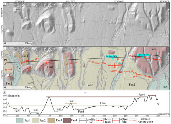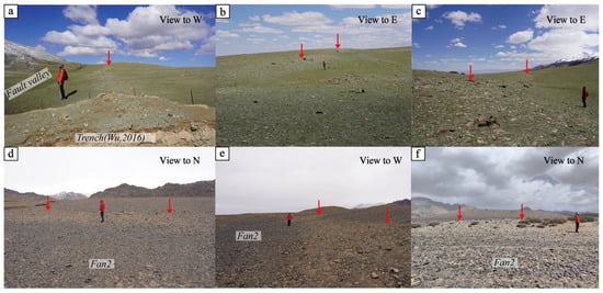 Based on the different elevations of the geomorphic surfaces along the fault (Figure 2) and their depositional characteristics, we roughly divided the geomorphic surfaces into four stages, from youngest to oldest, labeled as Fan1 to Fan4, using the Liushugou segment as a representative example. Fan1 represents the most recent deposition in the area and is found alongside relatively larger channels. Fan2 is a slightly older fluvial–alluvial terrace located between channels or gullies, and it is the most widely distributed in the region, with its surface covered by desert varnish-coated black gravels. Portions of the Fan2 terraces have undergone folding deformation (Figure 2). The newly discovered seismic surface rupture zone cuts across modern gully floodplains and the Fan1–Fan3 fluvial–alluvial terraces.