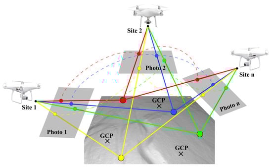 In recent years, advancements in UAV technology, computer vision theory, and automated feature matching algorithms have led to the integration of Structure from Motion (SfM) 3D reconstruction technology, originating from computer vision, into photogrammetry. This integration has significantly increased the level of automation in the photogrammetric process [2,25,26]. SfM refers to the process of efficiently extracting corresponding features from three or more images using advanced feature-matching algorithms and tracking these features from one image to another (Figure 3). This process initially recovers the relative positions of the camera during photography, which are then optimized using a nonlinear least squares method to ultimately determine the camera’s position and orientation, as well as the 3D spatial coordinates of the photographed object [2,27,28,29,30,31]. Compared to traditional photogrammetry methods, the SfM technique can quickly acquire high-precision topographic and geomorphic data from photographs taken from different angles of the target, significantly reducing measurement costs [2,26,32].