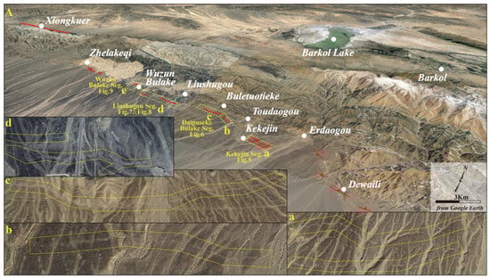 - Xu, L.; Ran, Y.; Liang, M.; Wu, F.; Gao, S.; Wang, H. Geometric Distribution and Characteristics of the Surface Rupture of Two Historical Earthquakes in the Barkol Basin, Xinjiang. Seismol. Geol. 2020, 42, 1–17. (In Chinese) [Google Scholar]
