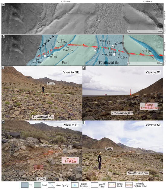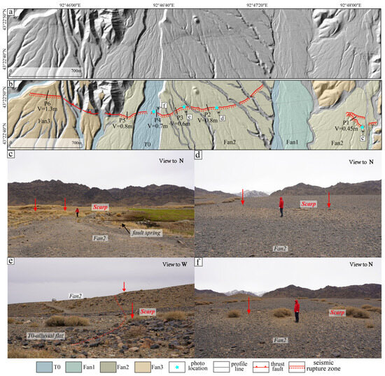 Features of seismic rupture zone in Daipuseke Bulake segment: (a) original geomorphic features showed by the Hillshade of DEM; (b) geomorphic surfaces and the distribution of the rupture zone; (c–f) typical photos of seismic rupture scarp (the red arrows indicate the seismic rupture scarp).