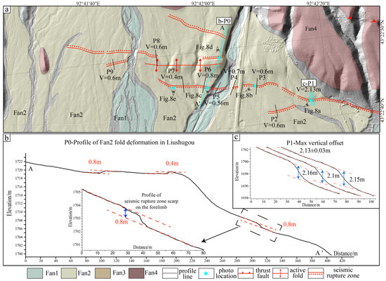 Distribution and features of seismic rupture zone in Liushugou segment: (a) geomorphic surfaces and the distribution of the rupture zone; (b) the profile of P0, showing Fan2 fold deformation and seismic rupture scarps on it; (c) the profile of the maximum offset.