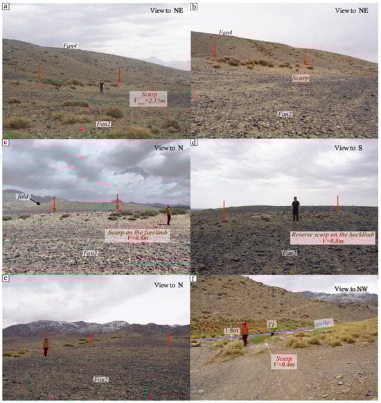 Typical photos of the seismic rupture zone in the Liushugou segment (the red arrows indicate the seismic rupture scarp): (a) the maximum vertical offset of the seismic rupture scarp; (b) the seismic rupture scarp west of the maximum vertical offset point; (c,d) the seismic rupture scarp on the fold; (e) the seismic rupture sca rp on Fan2; (f) the seismic rupture scarp on the Terrace1 of a gully on the west of Liushugou.