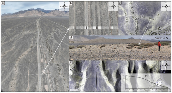 Characteristics of seismic rupture zone and its surrounding geomorphic surfaces: (a,b) the features of the dirt roads; (c,d) features of the scarp of the seismic rupture zone on the forelimb of Liushugou Fan2 fold; (e) features of the older scarp in Liushugou.