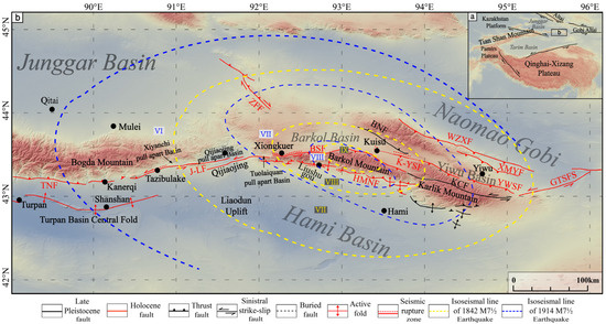 Isoseismal lines of 1842 and 1914 historical earthquakes near Barkol (modified from Gu et al. [21]): (a) the location index map of the study area.; (b) the distribution of isoseismal lines of two major historical earthquakes and the main active faults in the Eastern Tianshan.