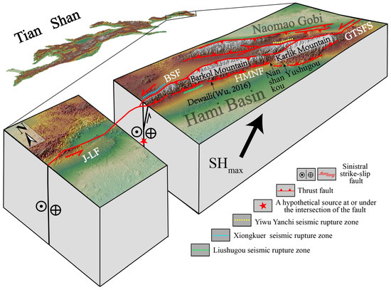 - Wu, F.; Ran, Y.; Chen, L.; Li, A. Distribution of 3 Earthquake Rupture Zones in Eastern Tianshan and Their Relationship with 2 Historical Earthquakes. Seismol. Geol. 2016, 38, 77–90. (In Chinese) [Google Scholar]