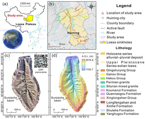 The selected key investigation area in this study is the Sunjiacha basin in Huining County (Figure 1a,b), with an area of about 2.40 km2, a length of approximately 2960 m, a width of around 1280 m, and an elevation ranging from 1724.10 to 2070.88 m. It has a typical combination of loess ridges and gullies, which are part of the semi-arid temperate monsoon climate. The surface vegetation mainly consists of sparse grasslands, with precipitation concentrated from May to September, totaling about 370 mm annually. Rainfall from a single heavy rain event can account for 96% of the monthly precipitation. The river channel normally experiences no runoff except during heavy or torrential rain periods, when runoff is generated [11]. The small watershed is characterized by numerous loess geological hazards (1194 collapsing sinkholes, 288 landslides, and collapses) with deep channels and severe soil erosion (mainly by gully erosion). Preliminary field surveys and studies revealed a high sinkhole density of up to 497.5 per km2, with a maximum depth of 29.6 m, a maximum diameter of 34 m, and a maximum volume of approximately 19,600 m3. The study area distributes these sinkholes in various locations, including gullies, valley heads, valley terraces, and terraced fields. The imagery and topography obtained from the airborne radar drone in the research area are shown in Figure 1c,d.