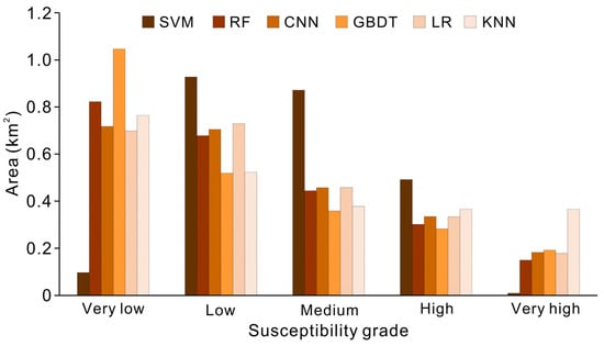Figure 6 shows the actual areas for each susceptibility level of the six models, with the SVM model indicating that low susceptibility has the largest area (0.93 km2), followed by medium susceptibility (0.87 km2), high susceptibility (0.49 km2), lower susceptibility (0.09 km2), and higher susceptibility (0.01 km2). Based on the RF model, the area of lower susceptibility is the largest (0.82 km2), followed by low susceptibility (0.68 km2), medium susceptibility (0.44 km2), high susceptibility (0.30 km2), and higher susceptibility (0.15 km2). In the CNN model, the largest area is in the lower susceptibility category at 0.72 km2, followed by 0.70 km2 (low susceptibility), 0.46 km2 (medium susceptibility), 0.33 km2 (high susceptibility), and 0.18 km2 (higher susceptibility). In the GBDT model, lower susceptibility has the largest area (1.05 km2), followed by low susceptibility (0.52 km2), medium susceptibility (0.35 km2), high susceptibility (0.28 km2), and higher susceptibility (0.19 km2). According to the LR model, the largest area of 0.73 km2 is for the low susceptibility category, followed by 0.70 km2 (lower susceptibility), 0.46 km2 (medium susceptibility), 0.33 km2 (high susceptibility), and 0.19 km2 (higher susceptibility). In the KNN model, the largest area (for lower susceptibility) is 0.76 km2, followed by low susceptibility (0.52 km2), medium susceptibility (0.38 km2), higher susceptibility (0.37 km2), and high susceptibility (0.37 km2). The general trend of area variation from the six models is the same as the frequency distribution histograms. This means that the areas with low and medium susceptibility are generally bigger in each model, while the areas with medium, high, and high susceptibility get smaller over time.