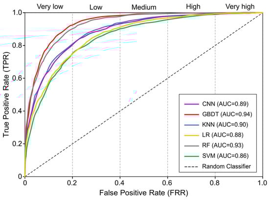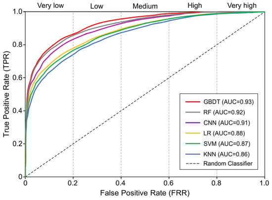 As shown in Figure 7, the validation results indicate that the GBDT model has the highest AUC value (0.94), followed by RF with 0.93, KNN with 0.90, CNN with 0.89, LR with 0.88, and SVM with 0.86. Accordingly, this study concludes that the predictive abilities of the GBDT, RF, and KNN models are excellent, with AUC values ≥ 0.9, while the CNN, LR, and SVM models also demonstrate a good predictive accuracy, with AUC values ≥ 0.8. The AUC values of GBDT and RF differ only by 0.01. However, susceptibility mapping shows that GBDT is more precise in identifying small and densely distributed sinkholes. Despite having a high AUC value, susceptibility mapping reveals a poor predictive performance for KNN. This is because the model uses a majority voting rule to predict whether a pixel is a sinkhole, resulting in high capability to distinguish sinkholes from non-sinkholes but a low accuracy in classifying susceptibility levels into five categories. Compared to other machine learning models, the CNN model requires a large amount of watershed data for effective training. However, our collection of watershed data is not as extensive as the terrain factor data, resulting in the CNN model’s relatively low predictive capability. Despite significant differences in feature extraction and training methods between the LR and CNN models, the AUC value of the LR model differs by only 0.01 from the CNN model. The susceptibility mapping and frequency distribution histograms of both models are very similar. The SVM model essentially distinguishes different categories based on decision boundaries. In this study, the complex data structure and issues like noise significantly affect the predictive performance, resulting in a lower prediction accuracy compared to the other five models.