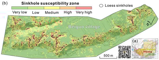 (3) The GBDT model has the best performance in predicting the susceptibility of loess sinkholes in Huining County (AUC = 0.94), especially in predicting potential sinkholes at the head of erosion gullies, the interior of erosion gullies, old landslides, and terraces;