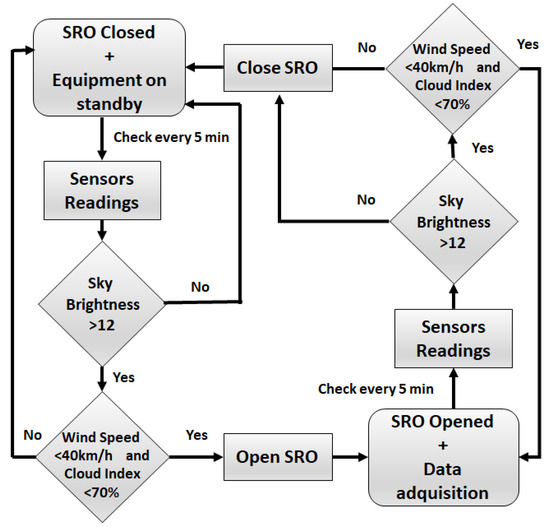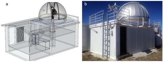 The SRO proposed in Figure 9 has been tested as a prototype and has given excellent results (the final dimensions of the SRO should be similar to those of a 10-foot shipping container). After implementing some design improvements and corrections for synchronized opening and closing of the roof, it has been completed with a new control system, so that the SRO can close at dawn and open its roof at dusk, based on a photometer whose threshold is at 12 magnitudes of apparent sky brightness [24]. This value marks the beginning of nighttime activity and its end with the arrival of dawn. In this way, the equipment is protected from the sun’s rays during the day.