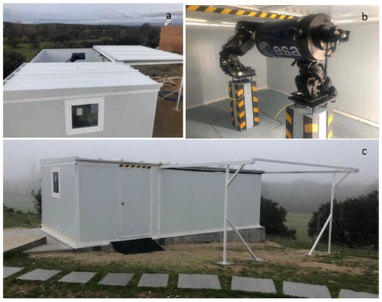 CESAR Astronomical Observatory. ESA-ESAC (Villafranca del Castillo-Madrid). RAO with open roll-off roof (a). S/C 12” telescopes (each one on one of the two pillars displayed in the picture) at f/10 and two CCD cameras, Atik 314 L+ and Atik 4400 (b). RAO with closed roll-off roof (c).