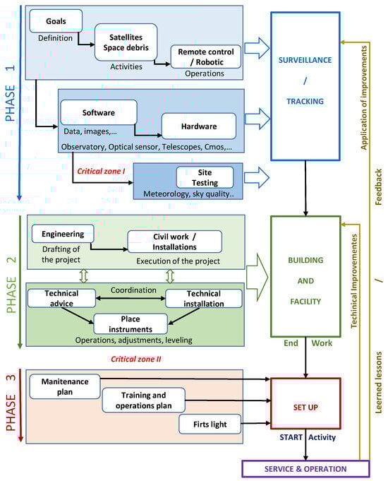 The premises stated above can be developed in three different phases (see Figure 3). In Phase 1, the objectives to be pursued must be defined, such as the detection, monitoring, and tracking of space debris and artificial satellites. Next, it must be specified how these activities will be developed, considering whether it is intended to work remotely or with human presence.
