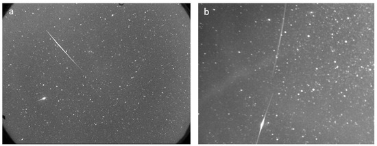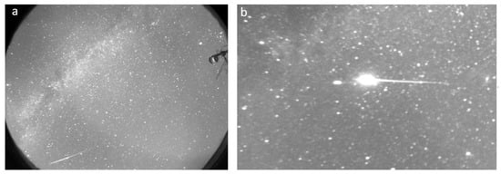 Image of a meteor during its entry into the Earth’s atmosphere, captured with sensor 1 and 20″ exposure (a). Image of bolide (meteor with an apparent brightness magnitude greater than the planet Venus) captured with sensor 2 with a 30″ exposure (b).