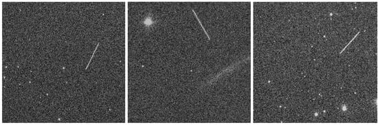 To determine the trajectory of artificial satellites and other Earth’s Resident Space Objects (RSOs), several image captures are necessary. For example, the trajectory of satellites in Low Earth Orbits (LEOs) can be determined with very short exposure times (less than one second) and wide-field optical lenses, but for more distant NEOs, characterized by lower apparent brightness, longer exposure times and smaller fields are required [21,27]. The combination of these techniques makes it possible to cover different areas of the firmament and allows a detailed study of the objects of interest, satellite constellations, and even space debris [33].