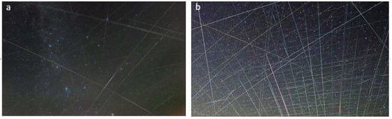 Image of the trajectory of an artificial satellite captured by sensor 1 with a 10″ exposure (a). Image of a satellite object and an Iridium captured by sensor 2 with an 8″ exposure (b).