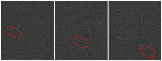 Image download times range from 4.2 s for the Atik 314 L+ to 27 s for the Atik 11000. Although this second CCD camera is capable of capturing objects whose apparent brightness magnitude is greater than 16, the long download times make it difficult to continuously track satellite objects in low orbits. The pictures in Figure 6, provided by the CCD 1100 instrument on the IAC80 Telescope of the Instituto de Astrofísica de Canarias (IAC), belong to three different satellites, which cannot be identified for security reasons. These images have been obtained raw without any processing. The image quality is remarkable, and the trajectory of the satellite object can be perfectly identified. When using CMOS format sensors, download times are drastically reduced. They are very short and even less than a second when capturing a LEO satellite. Furthermore, they are much more sensitive to light, making it possible to manufacture smaller devices with better performance (a thorough comparison between CCD and CMOS image sensors for space observation can be found in [22,23]). Table 2 includes the characteristics of the CMOS cameras used to capture images of satellite objects from Figure 7 and Figure 8.