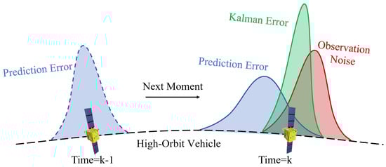 In Figure 1, the high-orbit vehicle with an initial position (Time = k − 1) conforms to a Gaussian distribution, where the blue dashed line represents the position distribution before the prediction error. The position of the next moment can be predicted through the dynamic model, and the predicted distribution (blue solid line) presents a Gaussian distribution. The related probability density function is shown in Formula (10), which usually increases the variance. When Time = k, the measurement information is obtained by further observation, and the measurement noise also presents a Gaussian distribution (solid red line), and its probability distribution function is shown in Formula (11). At this moment, we have two results of prediction and measurement, and the vehicle position estimate (green distribution) obtained by multiplying the two is shown in Formula (9).