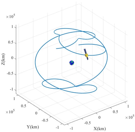 The six elements of the initial orbit of the high-orbit vehicle are shown in Table 1. The starting time is set at 20:00 on 1 January 2024. The GSTAR software of Beijing University of Aeronautics and Astronautics is used for simulation and recursion of the orbital data of the high-orbit vehicle from 20:00 on 1 January 2024 to 20:00 on 6 January 2024. The simulation track diagram is shown in Figure 2.