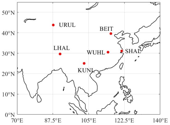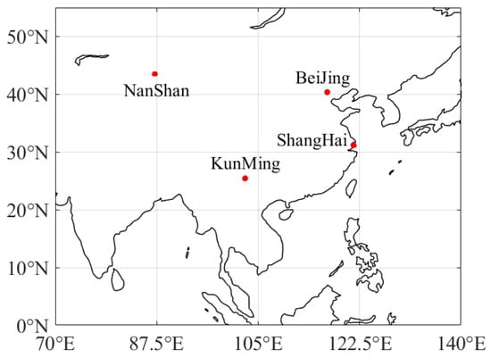 The data of global SLR stations come from the ILRS official website. This study primarily utilizes SLR stations located in China, and the distribution is shown in Figure 3. VLBI techniques are utilized in China, as in other space agencies, primarily for high-precision tracking and orbit determination of high-orbit and deep space spacecraft. The observation stations are all from domestic stations, namely, Beijing, Shanghai, Nanshan, and Kunming stations, and the coordinate positions are [31.1833°N, 121.4444°E], [25.432°N, 102.746°E], [43.4667°N, 87.1667°E], and [40.3588°N, 116.9058°E], as shown in Figure 4.