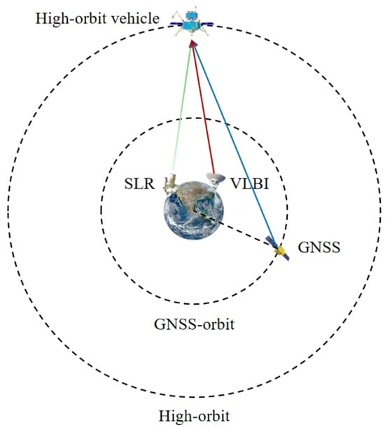 Geometric diagram of GNSS, SLR, and VLBI stations for high-orbit vehicle detection.