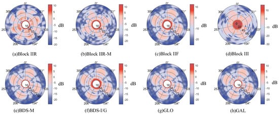 Figure 8 shows L1 of Block IIR, Block IIR-M, Block IIF, and Block III GPS navigation constellations released by NASA based on the ACE (Antenna Characterization Experiment) Navigation signal transmitting antenna gain mode over the frequency channel.