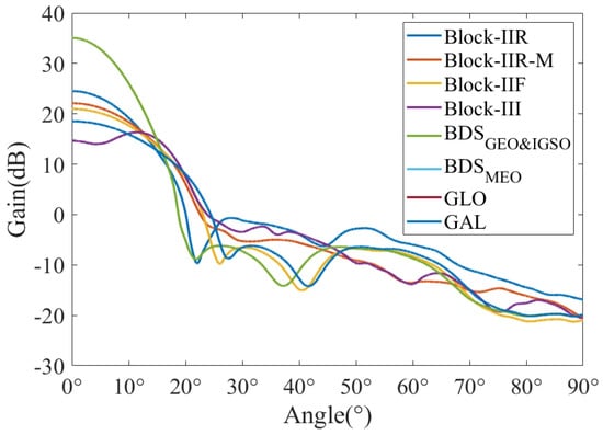In the simulation, the signal transmission gain patterns for the other three major navigation systems are derived based on the GPS Block-IIF satellite gain pattern. Specifically, the GPS Block-IIF gain pattern is scaled by a factor of 0.95 and then projected with a scaling transformation centered on the half-power beamwidth of the main lobe. This approach is used to generate the gain patterns for each of the navigation systems under consideration.
