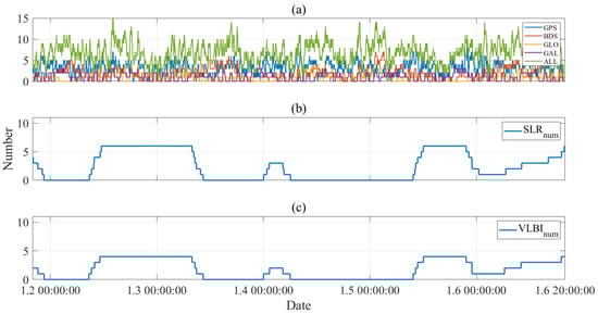 Figure 10b,c respectively represent the number of SLR stations and VLBI ground stations visible to high-orbit spacecraft. The maximum number of SLR stations and VLBI ground stations is six, and the maximum number of VLBI ground stations is four. It can be seen that the number of the two has a roughly similar trend over time. In some sessions (1.1 20:00:00–1.1 21:07:30, 1.2 9:48:00–1.3 8:55:00, 1.5 10:20:30–1.5 23:01:30, 1.6 10:12:30–1.6) 20:00:00), the number of visible observation stations of SLR and VLBI is greater than three, respectively, which meets the condition of single-system positioning.