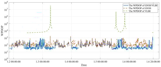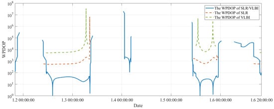 It can be found that with the change in time, the WPDOP value of the three systems is relatively slightly improved. In the period of single SLR or single VLBI orbit determination, the average WPDOP value of the three systems is 34.21, which hardly improves the accuracy compared with the GNSS/SLR and GNSS/VLBI dual systems. However, the accuracy is not as good as that of the SLR/VLBI dual system. In the single SLR or single VLBI undefinable orbit period, the accuracy of the three systems is improved by about two times compared with the GNSS/SLR dual system, the accuracy of the three systems is improved by about three times compared with the GNSS/VLBI dual system, and the accuracy of the SLR/VLBI dual system is improved by about two orders of magnitude compared with the SLR/VLBI dual system. In total, 90.58% of the time period meets the requirement of orbit determination, which exceeds the length of the available orbit determination time period of all dual systems.