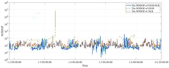 Furthermore, simulations conducted with the SLR measurement precision ranging from 0.01 m to 0.10 m reveal that the average WPDOP value of the three-system configuration during SLR-viable orbit determination periods exhibits only a minute variation of . This suggests that when the SLR measurement precision is the sole variable, the WPDOP value of the three-system configuration approaches its corresponding Cramér–Rao lower bound. Consequently, improvements in the SLR measurement precision have minimal effect on the WPDOP values of the three-system configuration.