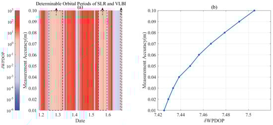In Figure 16, WPDOP represents the difference between the average WPDOP values of the three-system configuration and the SLR/VLBI dual-system configuration during periods when the orbit determination is possible using SLR alone. As shown in Figure 16a, within the orbit determination arc of the single VLBI system, the difference between the average WPDOP values of the three-system configuration and the single SLR system does not change significantly as the SLR observation precision improves. Figure 16b demonstrates that the SLR measurement precision has minimal impact on the WPDOP difference between the three-system and SLR/VLBI dual-system configurations, indicating that it does not significantly influence the selection of orbit determination observation strategies.