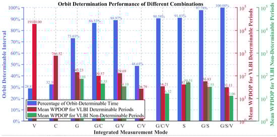 Among the three individual systems, GNSS demonstrates the highest single-system orbital determination accuracy with an average WPDOP of , while VLBI shows the lowest accuracy with an average WPDOP of . GNSS offers the longest viable orbital determination period, covering 73.03% of the total duration. The trackable duration for SLR and VLBI is similar, approximately 30% of the total time.