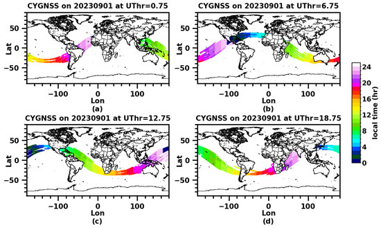 (a–d) Demonstration of local time (LT) coverages for CYGNSS at the indicated UT time plus or minus 0.75 hours (as shown in each title), on 1 September 2023.