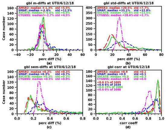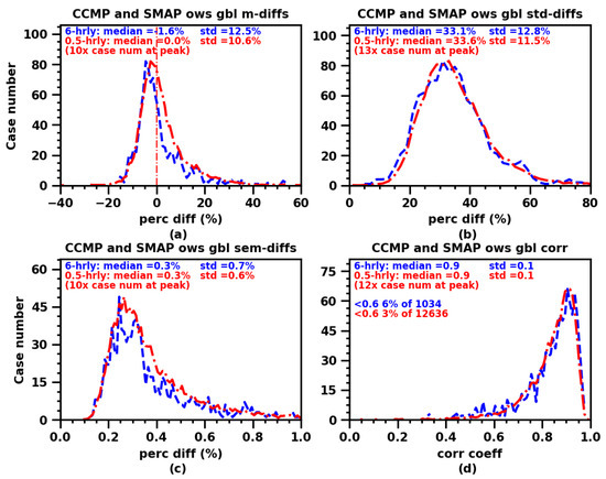 CCMP is linearly interpolated from the 4 UTs onto 0.5-hourly intervals, and same statistical moments of percent differences between CCMP and SMAP are calculated to compare with the results based on the 4 UTs per day. The maxima of the red histograms are adjusted (8–10 times) to match the blue curves. The y-axis numbers correspond to the blue histogram. The (a–d) resemble those in Figure 3.