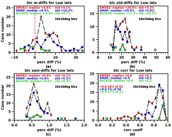 Same as Figure 3, except that the individual cases are 10° Lon × 10° Lat blocks identified as containing high-wind structures (i.e., TCs) in the low-latitude region between 35°S and 35°N. CYGNSS is not included because, based on our criteria, no high-wind features were identified. The (a–d) resemble those in Figure 3.