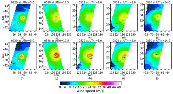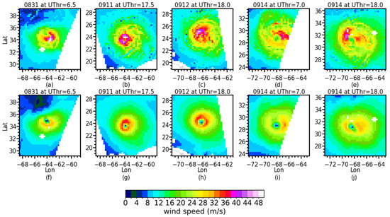 Figure 7, Figure 8 and Figure 9 display five pairs of maps, with each set chosen by the highest spatial correlation coefficients, showcasing the ability of AMSR2, SMAP, and ASCATB to capture TC structures. Figure 7 indicates that AMSR2 shows consistently higher TC wind speeds than CCMP, supporting the findings shown in Figure 6a. What is noteworthy is that AMSR2 is prone to capturing filament structures not visible in CCMP or other datasets used, suggesting that it may be better at capturing TCs’ small-scale structures. Additionally, CCMP maps often capture distinct TC eye centers with low winds (<8 m/s), while AMSR2 does not exhibit distinct eye centers in its eye region. Similarly, SMAP-measured winds are systematically higher than in CCMP, but the morphology of TCs exhibits better resemblance to CCMP compared to other datasets. As supported by Figure 6a, TC wind speeds in ASCATB are consistently lower than in CCMP, which may have led to the overall less-organized TC structures in most of its maps. Also, neither SMAP nor ASCATB maps show distinct eye centers.